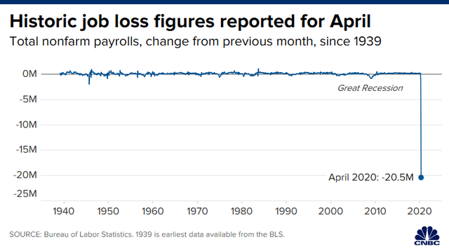 美国劳工部周五公布的数据显示,4月季调后非农就业人口录得-2050万人,预期为-2200万人,创纪录最大降幅;4月失业率录得14.7%,低于预期的16%,创纪录新高。