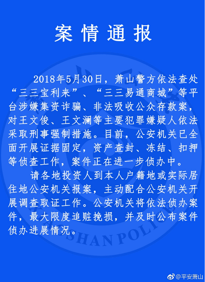 根据杭州市公安局萧山分局此前发布的案情通报,2018年5月30日,萧山警方依法查处“三三宝利来”、“三三易通商城”等平台涉嫌集资诈骗、非法吸收公众存款案,对王文俊、王文澜等主要犯罪嫌疑人依法采取刑事强制措施。