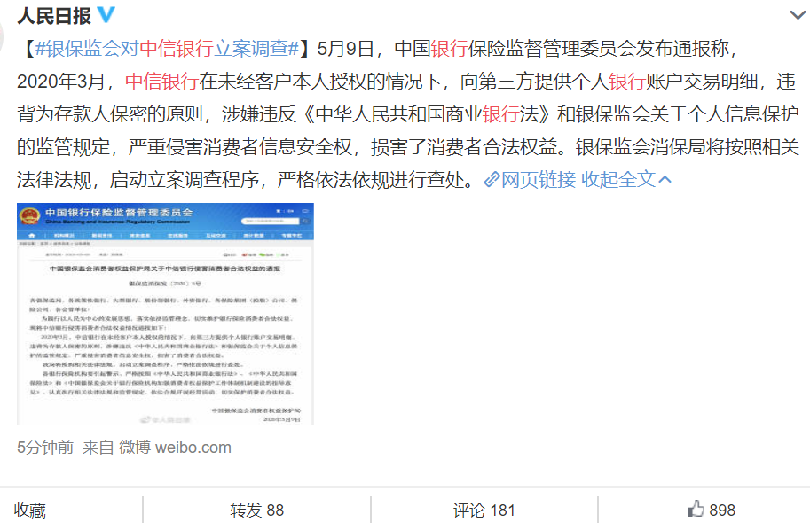 中信银行泄露脱口秀艺人池子信息事件,终于迎来重磅进展,银保监会对中信银行立案调查!