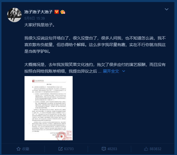 5月6日,上海笑果文化传媒有限公司(简称“笑果文化”)旗下脱口秀演员池子(原名王越池)在微博发布长文,称中信银行股份有限公司上海虹口支行(简称“中信银行上海虹口支行”)在未经其本人授权的情况下,将个人账户明细提供给与其有经济纠纷的笑果文化,诉其涉嫌“侵犯公民个人信息罪。”
