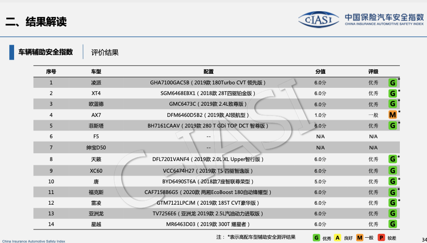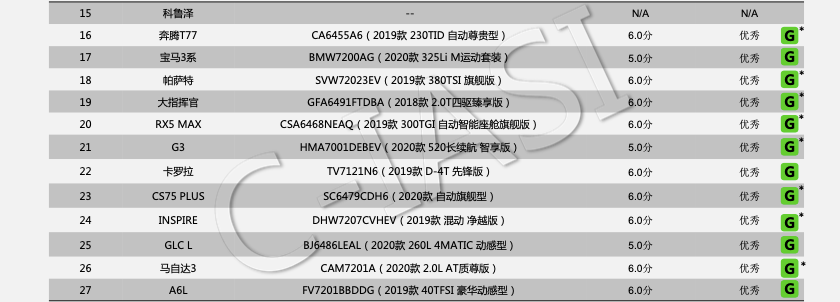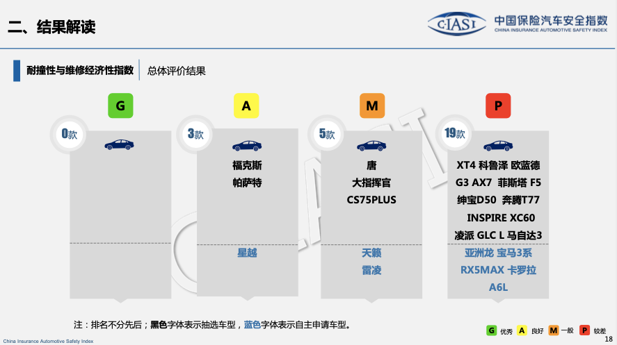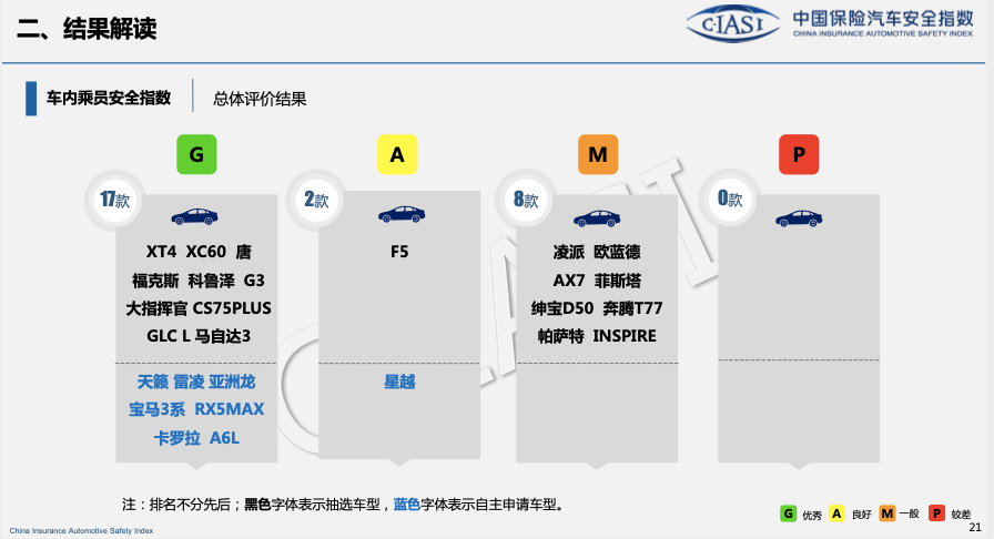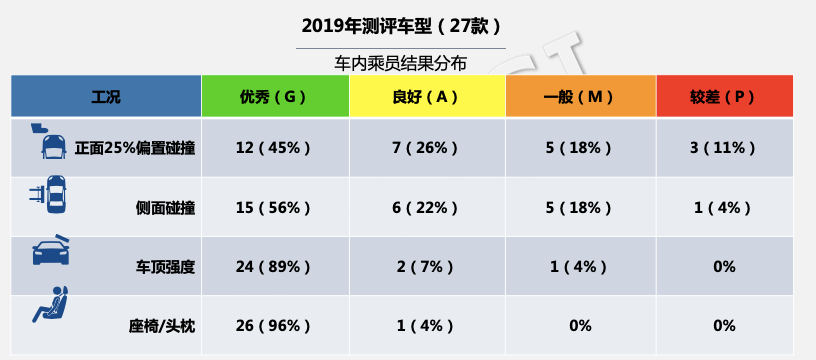车内乘员安全指数显示,有17款车型评价优秀(G),2款车型评价良好(A),其余车型均为一般(M)评价,获得良好及以上评价的车型占比70%。