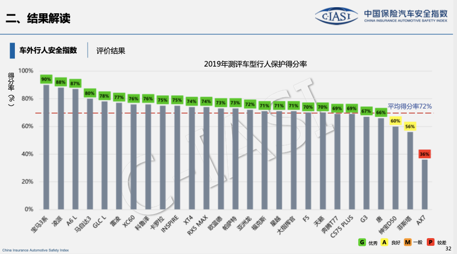 在车外行人安全指数测量行人头部和腿部的伤害。有26款车型获得了良好及以上评价,占比96%。