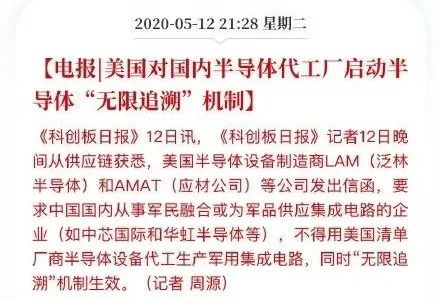 据《科创板日报》报道,记者12日晚间从供应链获悉,美国半导体设备制造商LAM(泛林半导体)和AMAT(应材公司)等公司发出信函,要求中国国内从事军民融合或为军品供应集成电路的企业(如中芯国际和华虹半导体等),不得用美国清单厂商半导体设备代工生产军用集成电路,同时“无限追溯”机制生效。