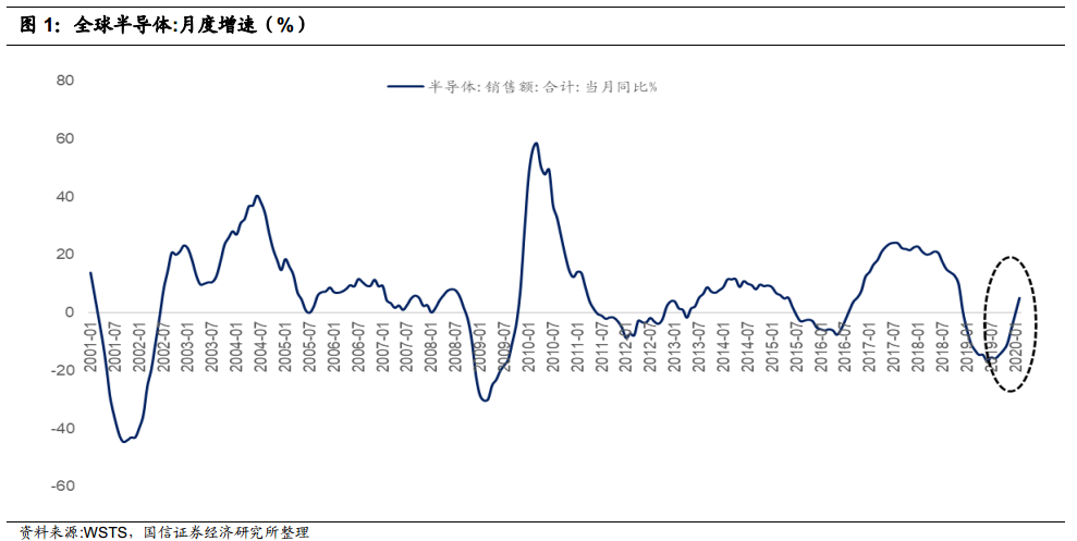全球半导呈现一定周期, 2000 年之前 IDM 模式主导时期,周期为 4~5 年。2000 年之后 Fabless+Foundry 模式主导时期周期缩减为 2~3 年。预计从 2020 年开始,全球半导体进入下一个周期的向上期。从全球半导体销售额月度增速看, 2020 年 2 月增速已经回到正增长,达到 5%。受到疫情影响,可能回暖速度放缓,但趋势不变。