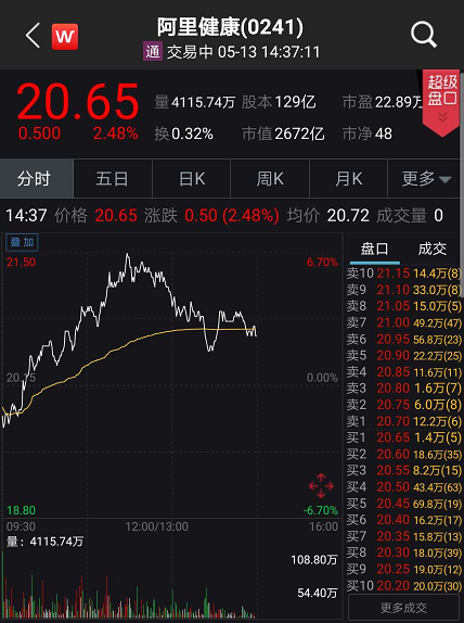 5月13日,延续前一日强势,港股上市公司阿里健康再度发力,开盘后股价猛烈上冲。当天上午,阿里健康股价大涨超6%,盘中市值突破2700亿元。截至港股午盘收盘,阿里健康报21.30港元,市值高达2756亿港元。