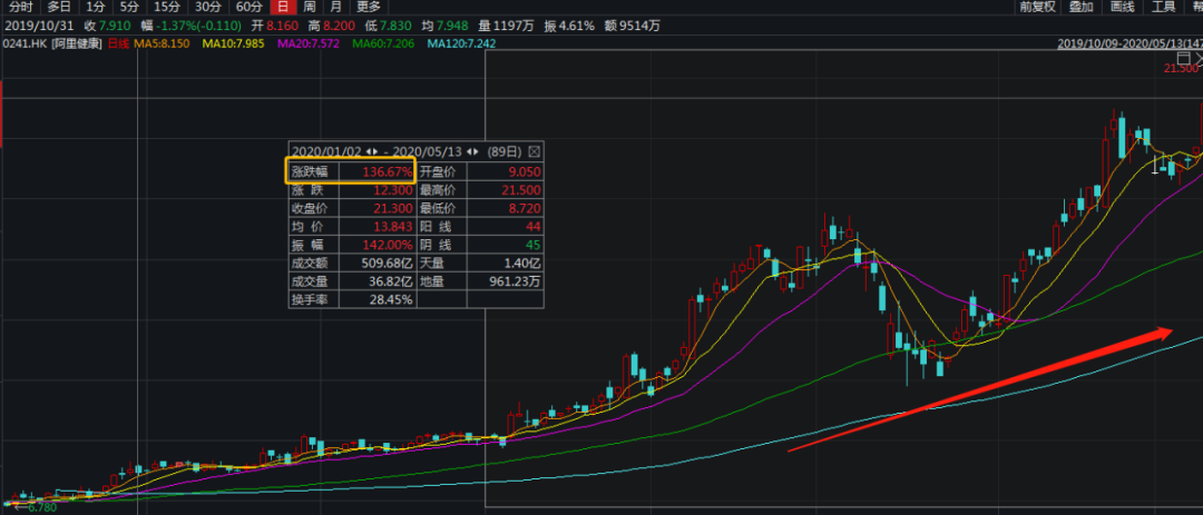 数据显示,年初至今,阿里健康股价累计上涨超130%,短短5个月市值暴涨千亿以上,成为港股市场妥妥的大白马公司。
