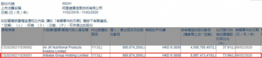 2月12日,港交所数据显示,2月6日阿里巴巴增持阿里健康8.608472亿股,每股作价9.38港元,总金额约为80.75亿港元。