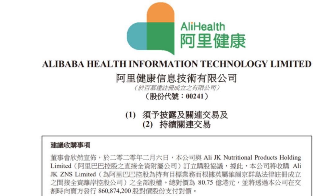 2020年2月7日,阿里健康公告宣布以80.75亿港元收购Ali JK ZNS Limited的全部股权,公司将向 Ali JK ZNSLimited 的持有人 Ali JK Nutritional Products Holding Limited(阿里巴巴控股的全资公司)发行8.6亿股新股,发行价9.38港元。