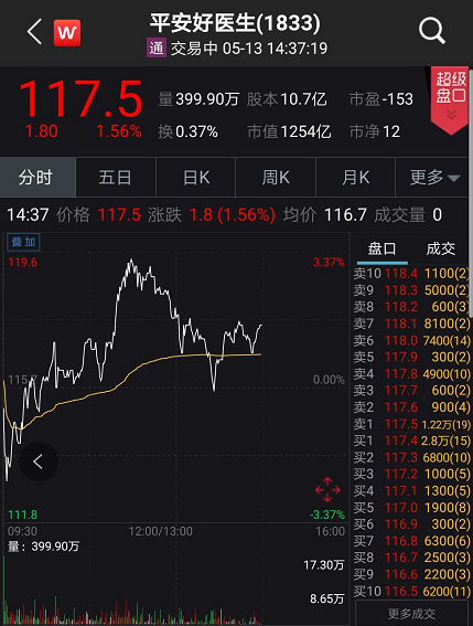 5月13日,港股市场医疗股活跃,平安好医生涨幅也十分明显。截至下午14点30分,平安好医生股价报117.5港元,涨1.56%,市值1254亿港元。