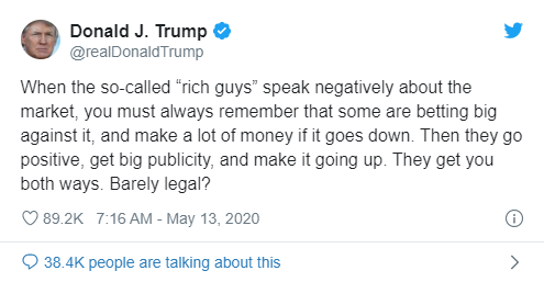特朗普在推特上写道,当那些所谓的“富人”说市场的坏话时,你必须永远记住,有些人是在做空市场,如果市场下跌,他们就会赚很多钱。然后他们转而看涨,积极地宣传,以促使市场上升。