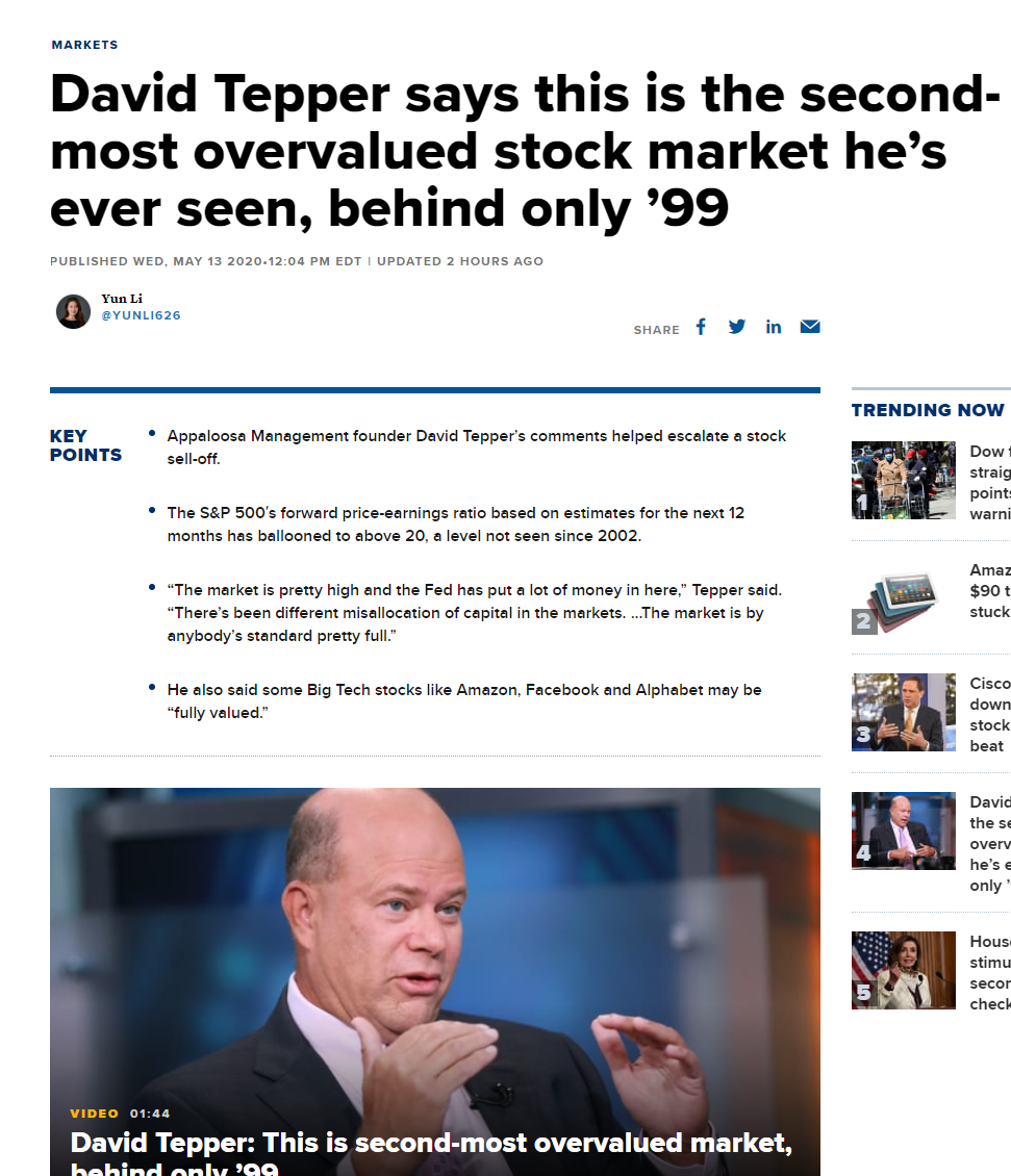 另一位亿万富翁大卫-泰珀(David Tepper)周三表示,眼下的股市是他所见过的最被高估的市场之一。