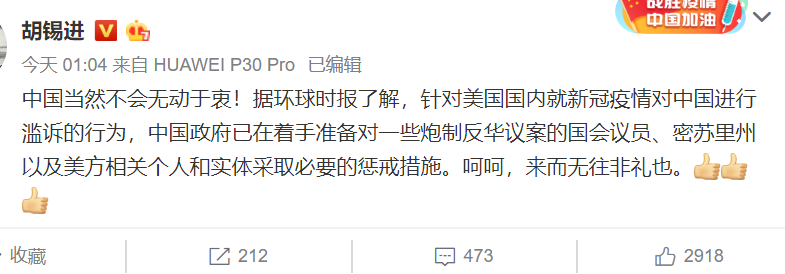 据环球时报报道,13日从相关消息人士处获悉,中方对美国内就疫情针对中国的滥诉极为不满,中国政府已在着手准备对一些炮制反华议案的国会议员、密苏里州以及美方相关个人和实体采取必要惩戒措施。有美国问题专家对《环球时报》记者表示,中国不会只是象征性地反制,“必须要打痛他。”