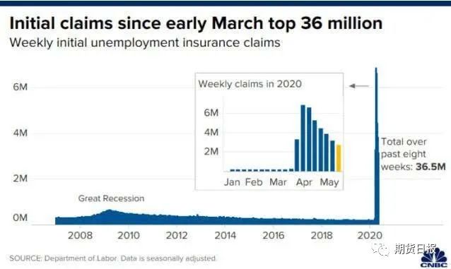 昨日晚间,美国劳工部发布申请失业金数据,美国至5月9日当周初请失业金人数录得298.1万人,为连续第六周下降,但远超市场预期。当周续请失业救济人数 2283.3万人,续刷历史新高。