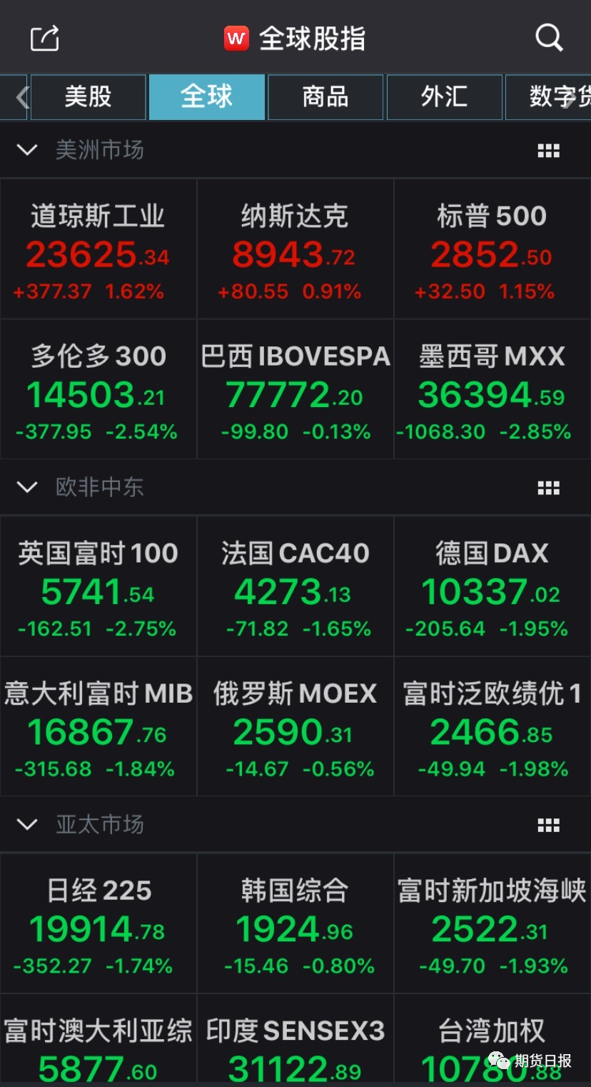 昨日,美国三大股指低开后展开V型反转。标普500指数开盘下跌27.30点,跌幅0.97%,报2792.71点;纳斯达克指数开盘下跌71.50点,跌幅0.81%,报8791.70点;道琼斯指数开盘下跌240.20点,跌幅1.03%,报23007.81点。截至收盘,标普500指数涨32.50点,涨幅1.15%,报2852.50点;纳斯达克指数上涨80.50点,涨幅0.91%,报8943.72点;道琼斯指数上涨377.40点,涨幅1.62%,报23625.34点。