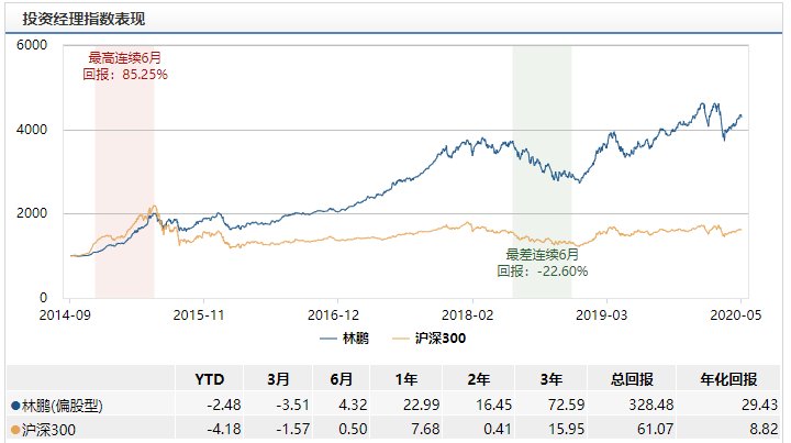 Wind信息显示,从各个指标对比来看,林鹏管理的基金表现良好,尤其是在2017年实现投资业绩爆发,其管理的东方红睿华沪港深曾以67.91%的复权净值增长率成为当年混合型基金的收益冠军。