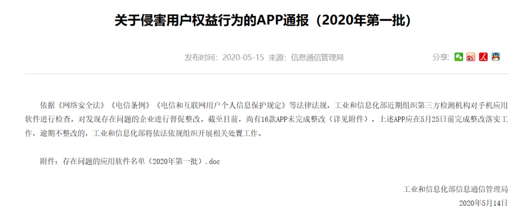 5月15日,工信部网站发布了《关于侵害用户权益行为的APP通报(2020年第一批)》。通报显示,依据《网络安全法》《电信条例》《电信和互联网用户个人信息保护规定》等法律法规,工信部近期组织第三方检测机构对手机应用软件进行检查,对发现存在问题的企业进行督促整改。