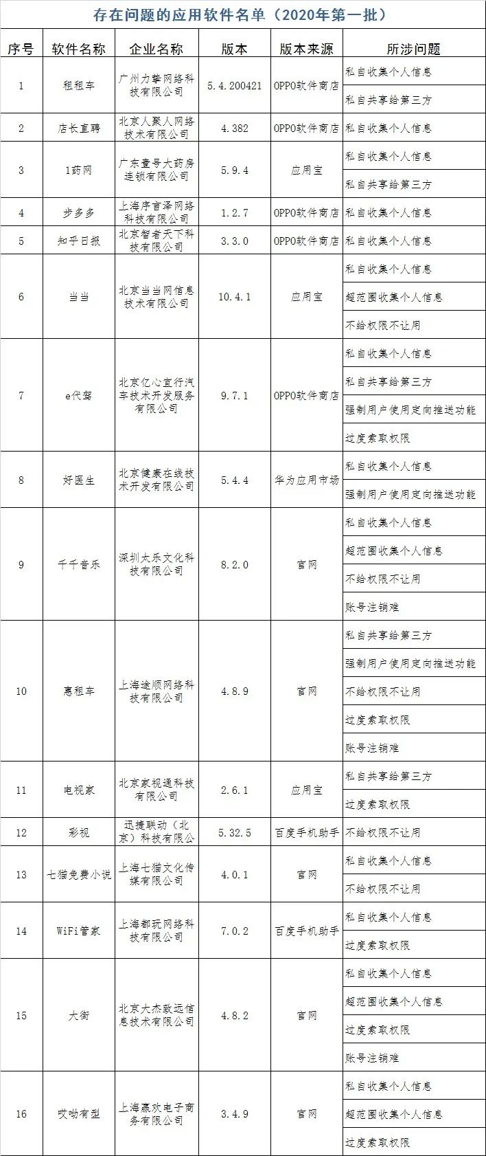 截至目前,尚有16款APP未完成整改,记者发现,这16款APP中包括用户量较大、知名度较高的当当、知乎日报、七猫免费小说、千千音乐,WIFI管家、好医生、e代驾等,侵权问题包括私自/超范围收集个人信息、私自共享给第三方、强制用户使用定向推动功能、过度索取权限、不给权限不让用、账号注销难等。