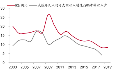 城镇中等收入户可支配收入增速低于M2增速