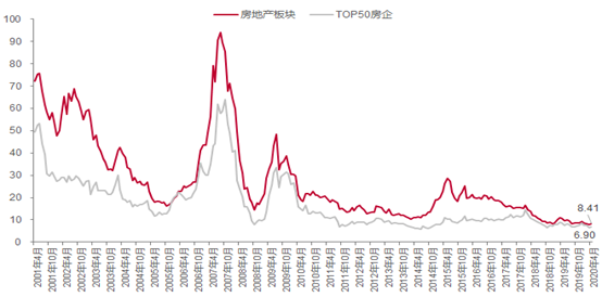 相较于管控较多的房地产市场,A股市场更能反映投资者预期,从A股市场上房地产板块的估值水平看,其平均市盈率从2007年最高时的90多倍,下行至目前的6.9倍(前50大房企的房地产作为主业收入占比更高),处在历史PE的2.2%分位,说明投资者对房地产板块的配置越来越少。