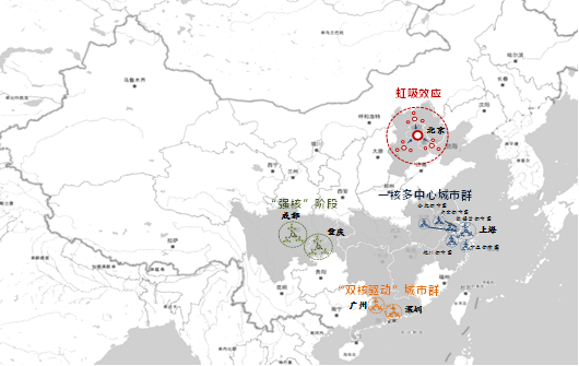 从2019年的数据看,山东省净流出人口为20万;河北为零增长,天津、北京也是净流出,辽宁人口继续为负增长,那么京津冀及周边区域还能继续看好吗?我认为,京津冀不同于长三角和珠三角,前者看,北京在发挥虹吸效应,导致“环京落差”,后者则出现辐射效应、协同发展,形成城市群。
