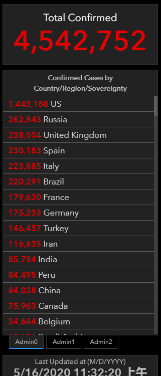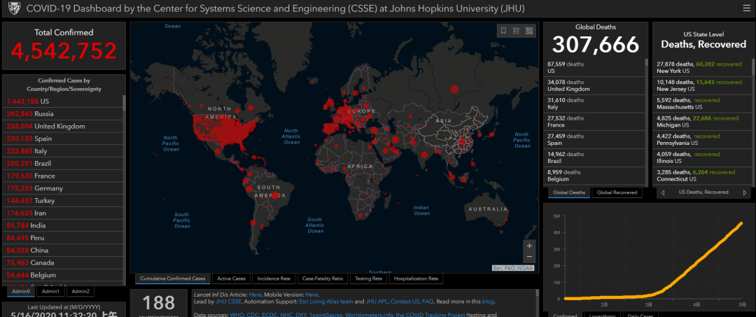 美国约翰斯·霍普金斯大学发布的实时统计数据显示,截至北京时间5月16日11时32分,全球累计确诊新冠肺炎病例4542752例,累计死亡307666例。