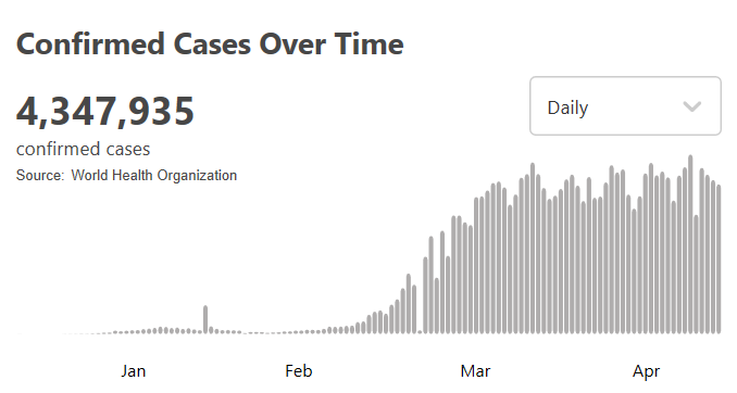 根据世卫组织最新实时统计数据,截至北京时间5月16日2时13分,全球确诊新冠肺炎4347935例,死亡297241例,中国以外超过426万例。