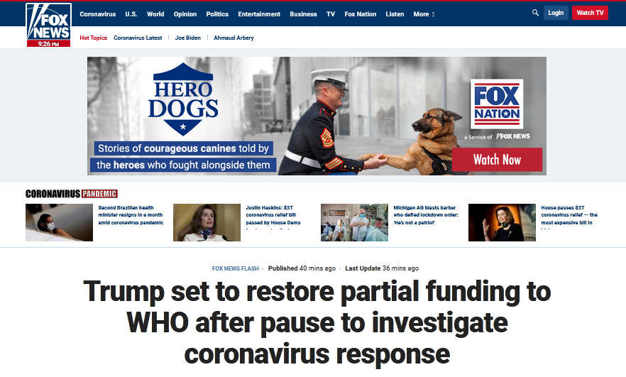 4月14日,特朗普宣布,美国暂停向世界卫生组织缴纳会费。他当天傍晚在白宫记者会上宣布这一决定。特朗普说,美国每年向世卫组织缴纳超过4亿美元会费,作为世卫组织的主要赞助方,美国有责任对世卫组织在疫情中的行为问责。