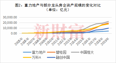 按照最近公布的2019年报数据,“碧万恒”三家均达到万亿元资产量级,其中最高者中国恒大为2.2万亿元。后来居上的融创中国,同期达到9606.49亿元。富力地产仅为4273.26亿元,不到龙头房企的体量半数(图2)。