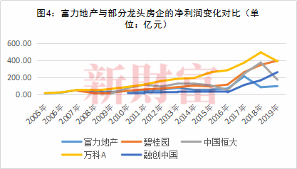 截至2019年底,“碧万恒”的营业收入均超过3600亿元(碧桂园最高为4866.93亿元),融创中国同期也达到近1720亿元,富力地产仅为911.43亿元,为龙头房企的20%-25%。净利润规模的差距亦然。