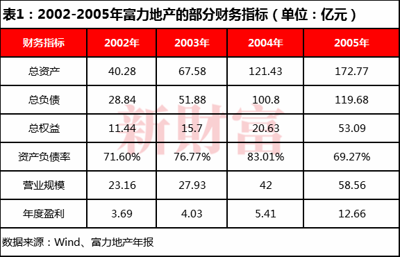 踏出广州5年后,富力地产一路所向披靡,迎来了第二个高峰期。数据显示,从2002至2005年,富力地产的资产规模、营业规模及利润规模分别增长了4.29倍、4.15倍、2.53倍、3.43倍(表1)。这相当于富力地产的体量每年增长了1倍左右。