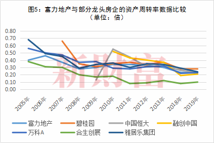大盘开发与商业地产的模式,决定了富力地产的资产低周转特征。由于上市之前的数据难以获取,我们拉长时间维度进行考察发现(图5),富力地产的资产周转率相对于万科、中国恒大、碧桂园和融创中国是最低的,而且这种状态几乎持续至今。