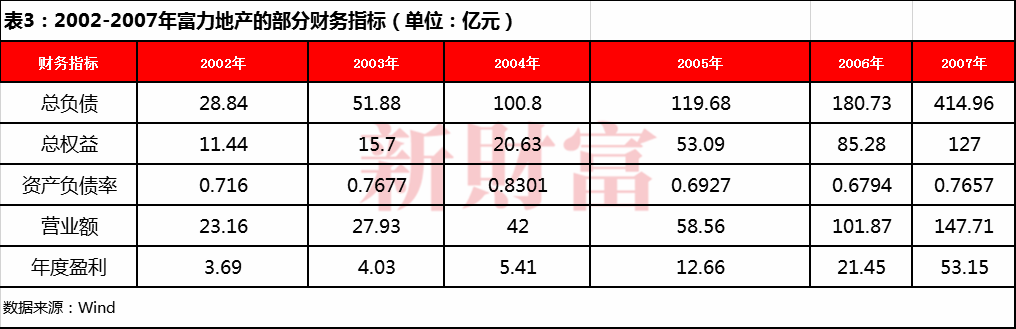 富力地产有多“冲动”?我们来看一组数据:2005年富力地产的资产规模比2002年增长4.28倍,每年平均增长1倍左右(表3)。但是到2007年,富力地产的资产规模比2005年增长3.14倍,相当于每年增长156%以上,也就是说,2年时间内其体量极速膨胀,再造了3个富力地产。这其中,在商业地产项目的投资超过80亿元,约占总负债规模的20%。