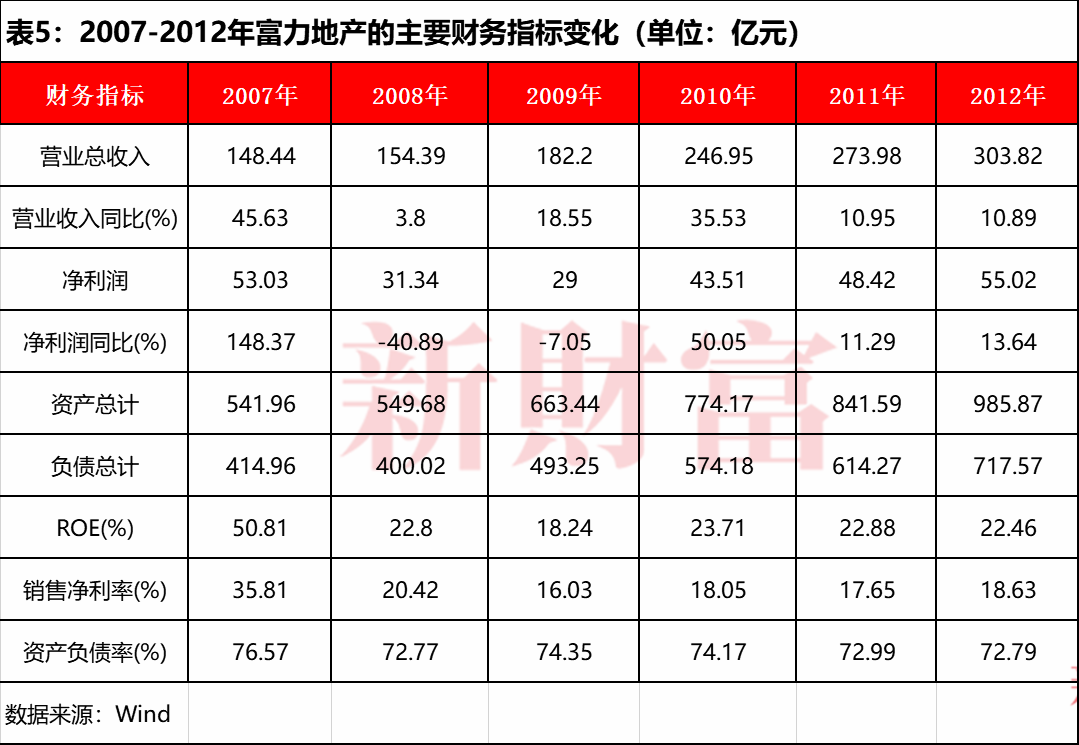 2010年至2012年,富力地产销售规模在300亿元左右徘徊。将2007年与2008-2012年的财务数据进行对比就会发现,当初这场“大跃进”令富力地产元气大伤。富力地产的ROE从2007年的50.81%骤降至22.8%之后,最低时候跌至18.24%。2008-2012年,富力地产的ROE停留在22%左右,与此前不可同日而语了(表5)。总的来说,2008年之后数年,富力地产连续数年处在疗伤的状态,持续了近5年时间。