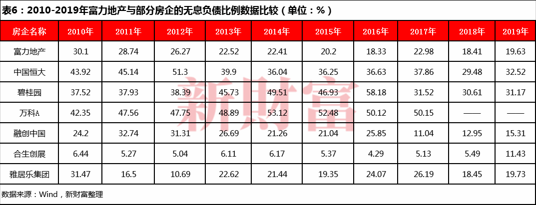 通过Wind公布的原始资产负债数据,可以计算房企无息负债(主要包括预收款和应付款项)的占款比例。数据显示(表6),富力地产的无息负债占比多在20%-22%,中国恒大多居于35%-40%,碧桂园多介于35%-50%,融创中国多在25%-30%,万科A则最高,多介于45%-50%,合生创展最低,几乎在7%以下。