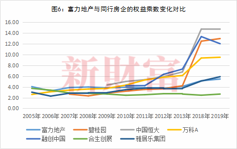 从权益乘数指标看(图6),在2009年之前,富力地产的权益乘数是7家房企中最高者。2009年之后,富力地产的权益乘数保持相对稳定,而同行如中国恒大、融创中国、碧桂园等则迅速上升。相反,合生创展的权益乘数是稳居末位的,并且持续下降。