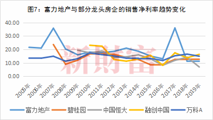 如前文提及,早前数年,富力地产的销售净利润率相对同行遥遥领先。不过随着时间的推演,富力地产的高销售净利润率优势已不存在了。2007年,富力地产的销售净利率分别超过碧桂园、万科12.13和20.84个百分点;但是到2019年,富力地产的销售净利率已经分别落后二者1.51和3.92个百分点。2018年,富力地产在5家房企中最低,2019年位居倒数第二。