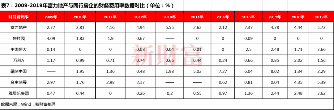 财务费用率数据显示(表7),中国恒大、碧桂园等房企的该项指标多保持在2.5%以下,富力地产多在4%以上,融创中国2014-2017年连年高达5%以上,其他年份的财务费用率则持续维持在相对低位。将比较范围扩大至合生创展、雅居乐集团,结果亦然。总体上看,富力地产的财务费用率是其中最高者之一。