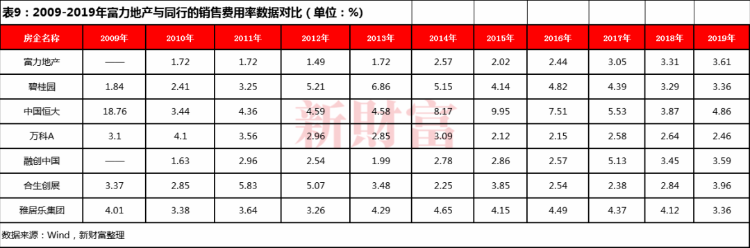 富力地产的销售费用率相对较低,总体上远低于中国恒大、碧桂园。中国恒大的营销向来风生水起,其销售费用率高企也在情理之中。不过,从动态变化来看,富力地产的销售费用率指标是连年震荡上升的,从2010年的1.72%上涨至2019年的3.61%,10年间已增长1倍以上(表9)。
