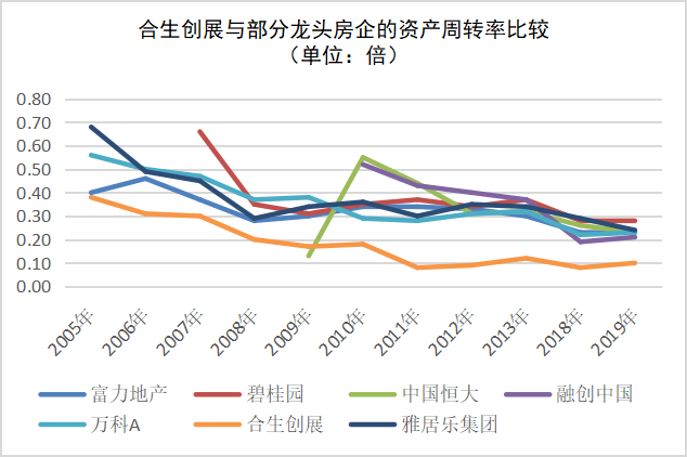 如图所示,合生创展的资产周转率对比同行处于很低的水平。2005-2019年,合生创展的资产周转率远远低于中国恒大、碧桂园、万科等头部房企,甚至低于持有大量商业项目的富力地产。