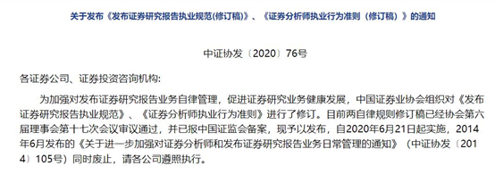 为加强对发布证券研究报告业务自律管理,促进证券研究业务健康发展,5月22日晚间,中国证券业协会对《发布证券研究报告执业规范》、《证券分析师执业行为准则》进行了修订。