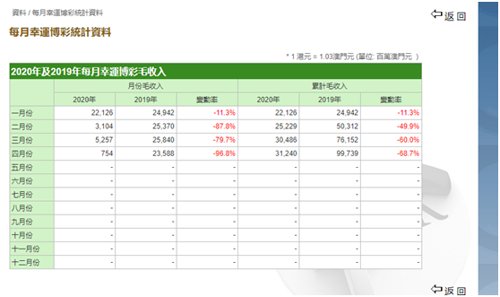 不过,由于受到疫情严重冲击,澳门博彩收入大幅下滑。根据澳门特区博彩监察协调局最新公布的每月幸运博彩统计数据显示,截至2020年4月底,澳门幸运博彩毛收入为7.54亿澳门元,同比暴跌96.8%,去年同期博彩收入235.88亿澳门元。