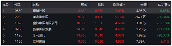 其他大型博彩公司中,银河娱乐盘中涨幅超过4%。金沙中国有限公司、永利澳门等均现大幅拉升。