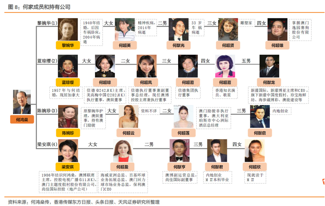 除祖业澳博之外,赌王何鸿燊二房子女还持有美高梅中国22%股权,同属二房的何猷龙则是新濠国际发展(0200.HK)、新濠博亚娱乐(MLCO.US)的实际控制人,三房太太陈婉珍目前与二女儿何超莲共同持股澳门励骏(1680.HK)。