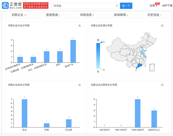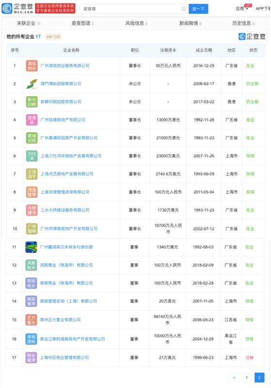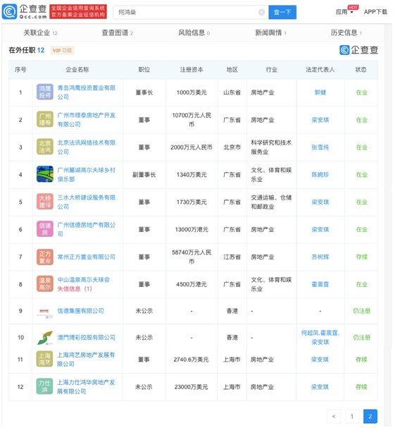 企查查数据显示:何鸿燊名下共有12家企业,其妻子梁安琪担任6家企业法定代表人。