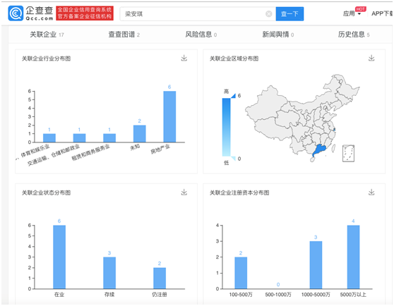 梁安琪名下共有17家企业,目前有一家是注销状态。