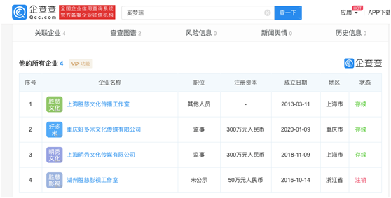 奚梦瑶名下4家公司 企查查数据显示与何猷君暂无工商联系
