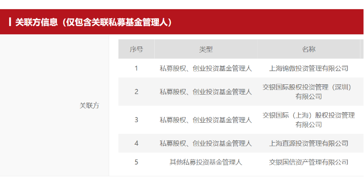 交银资本的关联私募基金管理人有5个,分别是上海锦傲投资管理有限公司、交银国际股权投资管理(深圳)有限公司、交银国际(上海)股权投资管理有限公司、上海直源投资管理有限公司、交银国信资产管理有限公司。