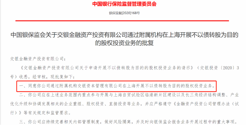 批复显示,《交银金融资产投资有限公司关于申请开展不以债转股为目的的股权投资业务的请示》(交银投资〔2020〕3号)收悉。经审核,同意交银投资通过附属机构交银资本管理有限公司在上海开展不以债转股为目的的股权投资业务。