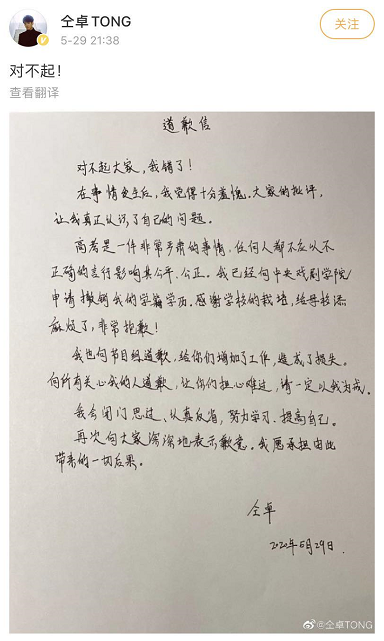 5月29日21:38分,曾在直播中自称改往届生身份参加高考的男星仝卓在其微博发布道歉信。