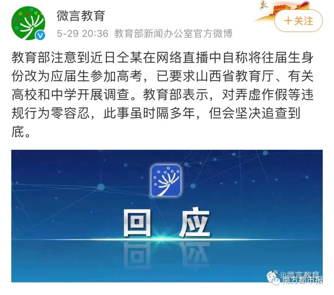 据教育部注意到近日仝某在网络直播中自称将往届生身份改为应届生参加高考,已要求山西省教育厅、有关高校和中学开展调查。教育部表示,对弄虚作假等违规行为零容忍,此事虽时隔多年,但会坚决追查到底。